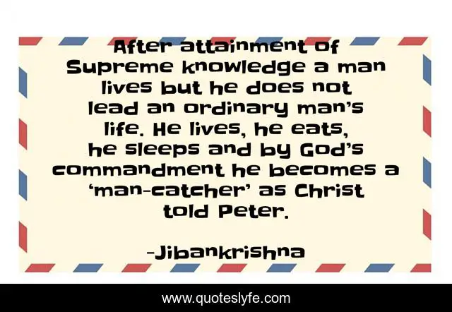 This page presents the quote "After attainment of Supreme knowledge a man lives but he does not lead an ordinary man’s life. He lives, he eats, he sleeps and by God’s commandment he becomes a ‘man-catcher’ as Christ told Peter.". Author of this quote is Jibankrishna. This quote is about god, supreme, peter, christ, knowledge,.