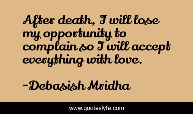 This page presents the quote "After death, I will lose my opportunity to complain so I will accept everything with love.". Author of this quote is Debasish Mridha. This quote is about love, opportunity-to-complain, accept-everything-with-love, philosophy, debasish-mridha, life-wisdom, quotes, after-death, inspirational,.