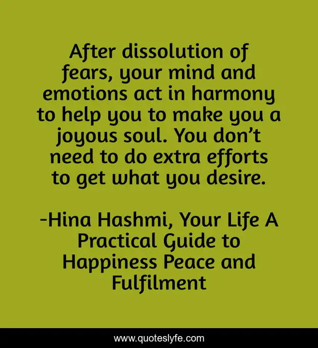 This page presents the quote "After dissolution of fears, your mind and emotions act in harmony to help you to make you a joyous soul. You don’t need to do extra efforts to get what you desire.". Author of this quote is Hina Hashmi, Your Life A Practical Guide to Happiness Peace and Fulfilment. This quote is about desire, joy, fear, mind-power, emotions,.
