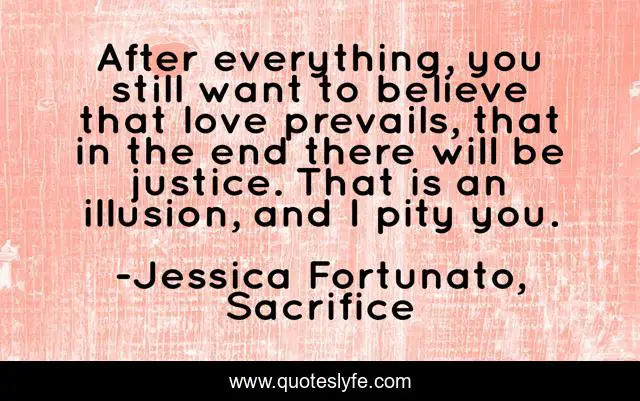 This page presents the quote "After everything, you still want to believe that love prevails, that in the end there will be justice. That is an illusion, and I pity you.". Author of this quote is Jessica Fortunato, Sacrifice. This quote is about fool, pity, love, justice, sacrifices, villain, the-sin-collector, illusion, affection,.