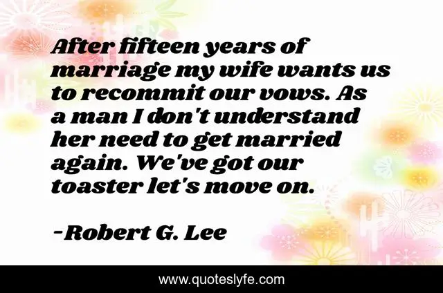 This page presents the quote "After fifteen years of marriage my wife wants us to recommit our vows. As a man I don't understand her need to get married again. We've got our toaster let's move on.". Author of this quote is Robert G. Lee. This quote is about love, marriage, affection,.