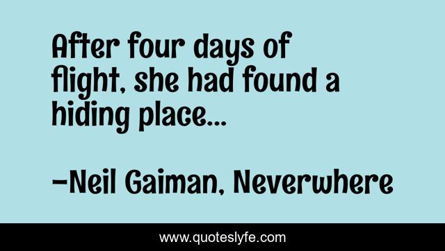 This page presents the quote "After four days of flight, she had found a hiding place...". Author of this quote is Neil Gaiman, Neverwhere. This quote is about flight, security, highing-place, hide,.