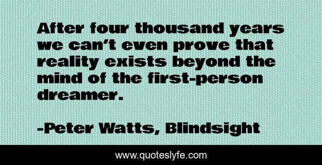 This page presents the quote "After four thousand years we can’t even prove that reality exists beyond the mind of the first-person dreamer.". Author of this quote is Peter Watts, Blindsight. This quote is about first-person, dreamer, reality,.