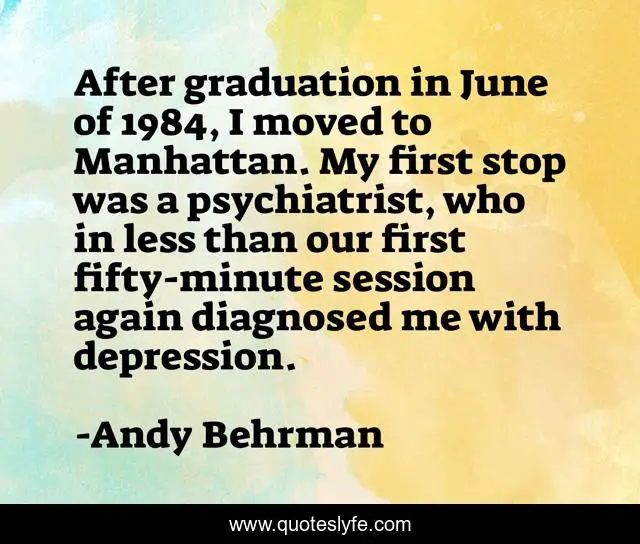 This page presents the quote "After graduation in June of 1984, I moved to Manhattan. My first stop was a psychiatrist, who in less than our first fifty-minute session again diagnosed me with depression.". Author of this quote is Andy Behrman. This quote is about me, stop, depression,.