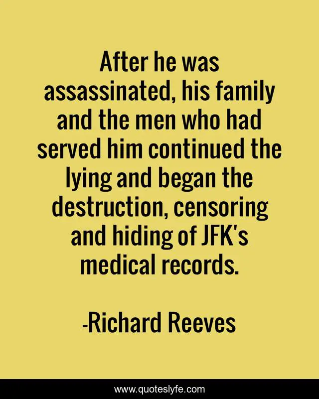This page presents the quote "After he was assassinated, his family and the men who had served him continued the lying and began the destruction, censoring and hiding of JFK's medical records.". Author of this quote is Richard Reeves. This quote is about men, family, lying,.