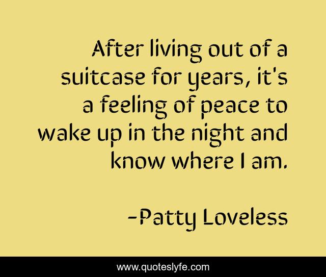 This page presents the quote "After living out of a suitcase for years, it's a feeling of peace to wake up in the night and know where I am.". Author of this quote is Patty Loveless. This quote is about wake up, night,.
