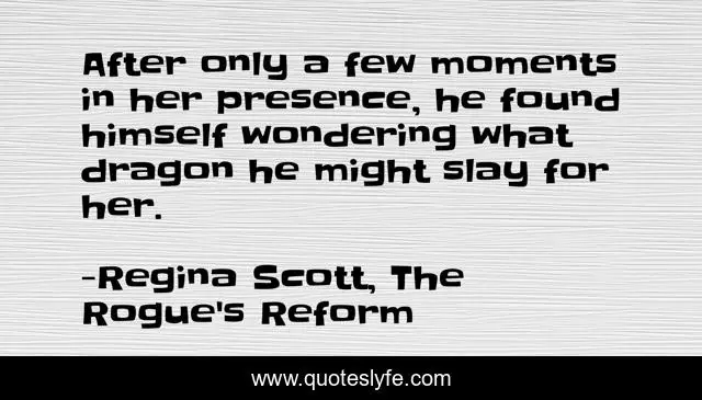 This page presents the quote "After only a few moments in her presence, he found himself wondering what dragon he might slay for her.". Author of this quote is Regina Scott, The Rogue's Reform. This quote is about mystery, chivalry, series, dragons, regency, legacy, dragon,.