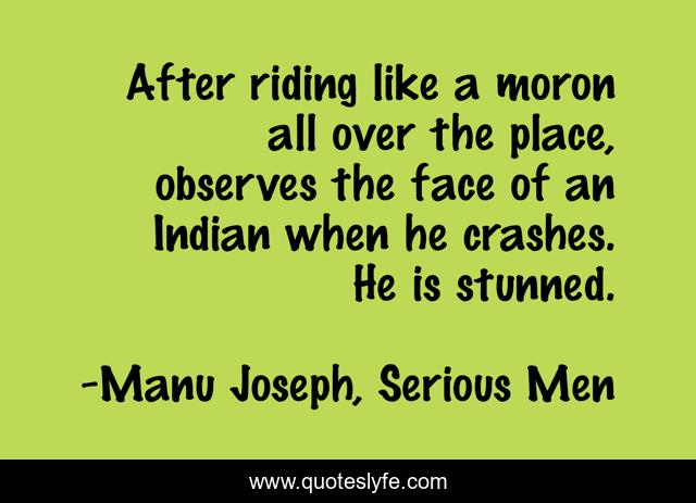 This page presents the quote "After riding like a moron all over the place, observes the face of an Indian when he crashes. He is stunned.". Author of this quote is Manu Joseph, Serious Men. .