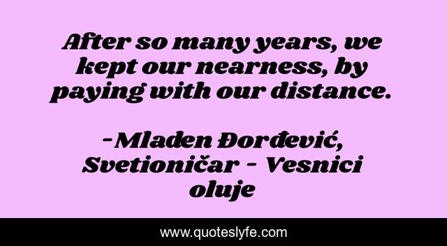 This page presents the quote "After so many years, we kept our nearness, by paying with our distance.". Author of this quote is Mladen Đorđević, Svetioničar - Vesnici oluje. This quote is about distance, love, relationship, price, nearness, past, present, affection,.