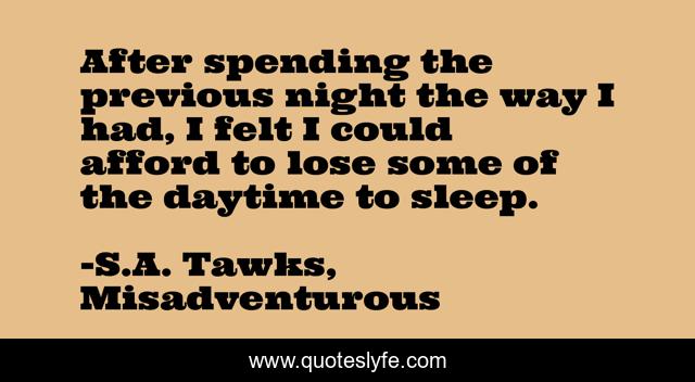 This page presents the quote "After spending the previous night the way I had, I felt I could afford to lose some of the daytime to sleep.". Author of this quote is S.A. Tawks, Misadventurous. This quote is about australia, brisbane, crime, adventure, queensland, adventurous,.