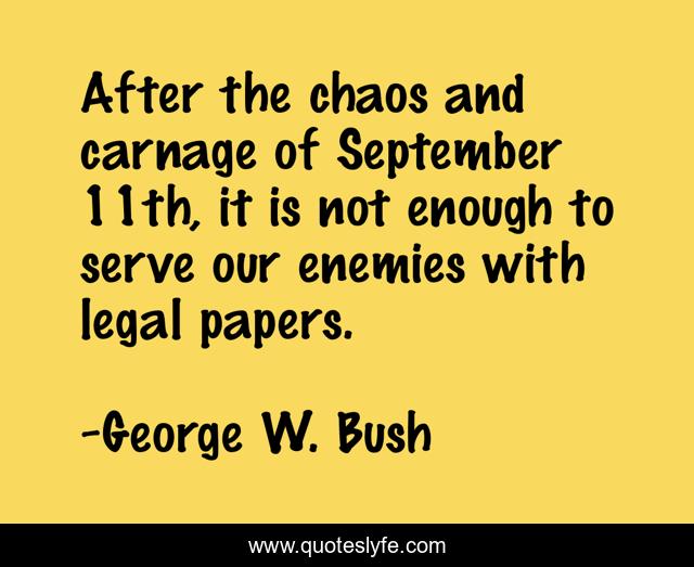 This page presents the quote "After the chaos and carnage of September 11th, it is not enough to serve our enemies with legal papers.". Author of this quote is George W. Bush. This quote is about september, serve, chaos,.