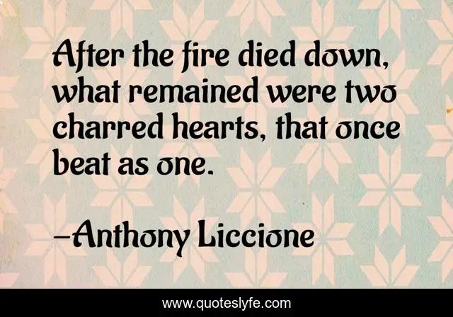 This page presents the quote "After the fire died down, what remained were two charred hearts, that once beat as one.". Author of this quote is Anthony Liccione. This quote is about disappear, love, wane, fire, faint, empty, dead, fall-away, charred,.