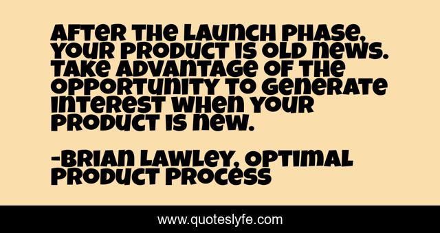 This page presents the quote "After the launch phase, your product is old news. Take advantage of the opportunity to generate interest when your product is new.". Author of this quote is Brian Lawley, Optimal Product Process. This quote is about launch, products, product-management, interest, ideas,.