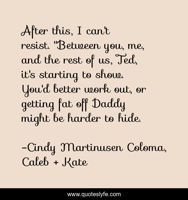 This page presents the quote "After this, I can't resist. "Between you, me, and the rest of us, Ted, it's starting to show. You'd better work out, or getting fat off Daddy might be harder to hide.". Author of this quote is Cindy Martinusen Coloma, Caleb + Kate. This quote is about funny, comedy, fat,.