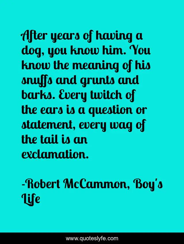 This page presents the quote "After years of having a dog, you know him. You know the meaning of his snuffs and grunts and barks. Every twitch of the ears is a question or statement, every wag of the tail is an exclamation.". Author of this quote is Robert McCammon, Boy's Life. .
