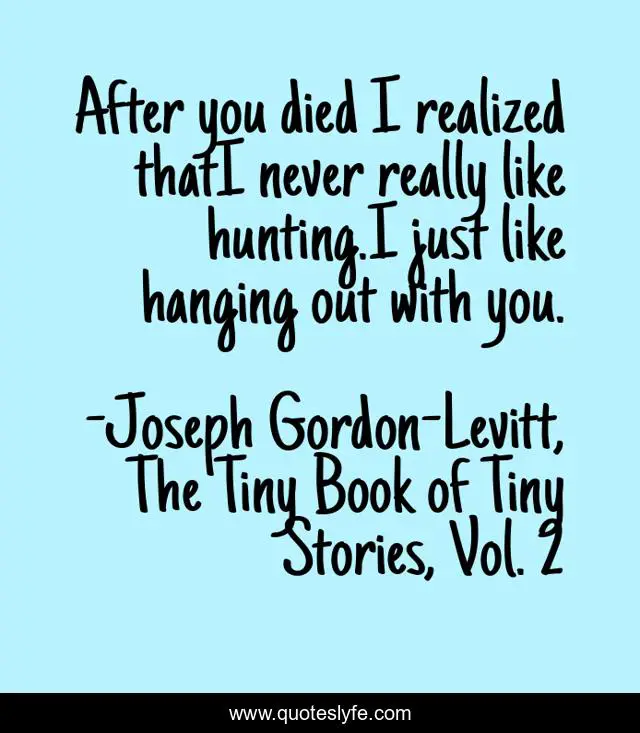 This page presents the quote "After you died I realized thatI never really like hunting.I just like hanging out with you.". Author of this quote is Joseph Gordon-Levitt, The Tiny Book of Tiny Stories, Vol. 2. This quote is about die, hunting,.