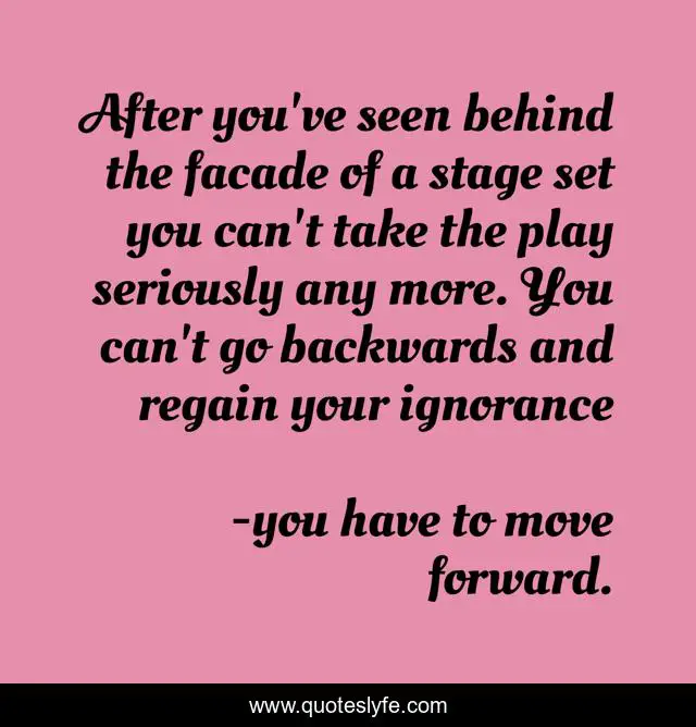 This page presents the quote "After you've seen behind the facade of a stage set you can't take the play seriously any more. You can't go backwards and regain your ignorance". Author of this quote is you have to move forward.. .