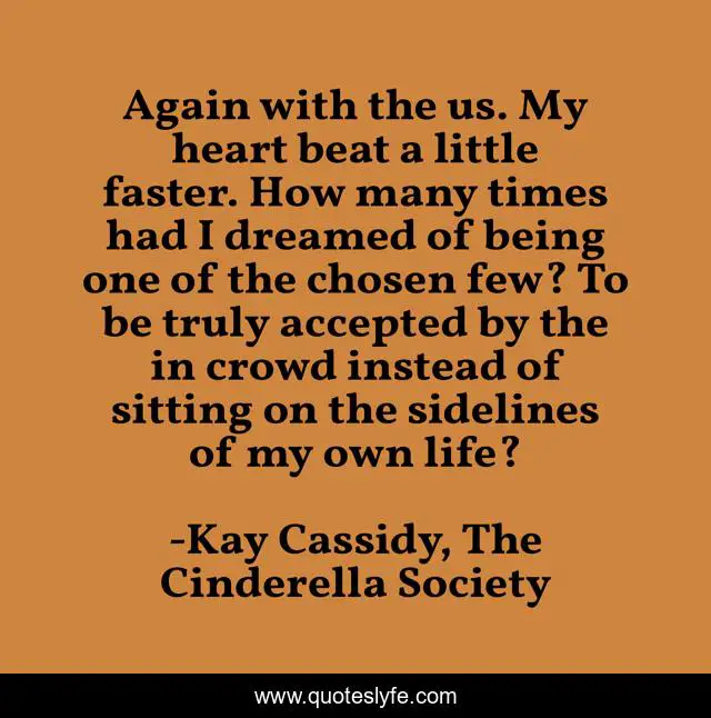 This page presents the quote "Again with the us. My heart beat a little faster. How many times had I dreamed of being one of the chosen few? To be truly accepted by the in crowd instead of sitting on the sidelines of my own life?". Author of this quote is Kay Cassidy, The Cinderella Society. .