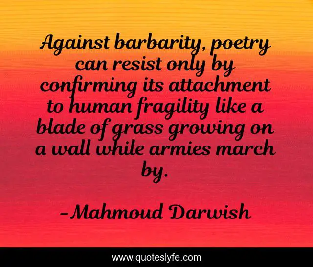 This page presents the quote "Against barbarity, poetry can resist only by confirming its attachment to human fragility like a blade of grass growing on a wall while armies march by.". Author of this quote is Mahmoud Darwish. This quote is about growing, grass, human,.