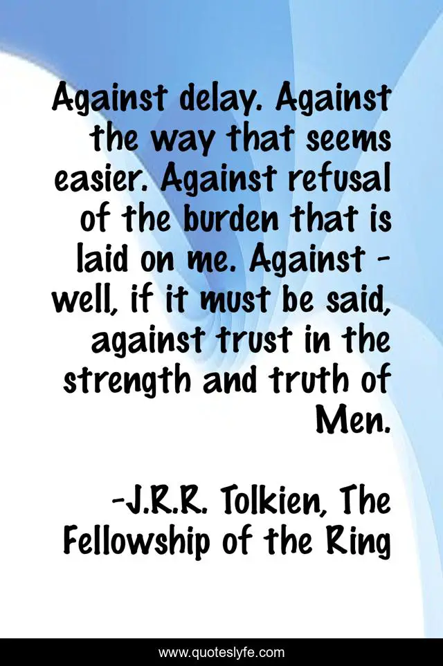 This page presents the quote "Against delay. Against the way that seems easier. Against refusal of the burden that is laid on me. Against - well, if it must be said, against trust in the strength and truth of Men.". Author of this quote is J.R.R. Tolkien, The Fellowship of the Ring. This quote is about lord-of-the-rings, fellowship, men, j-r-r-tolkien, frodo,.