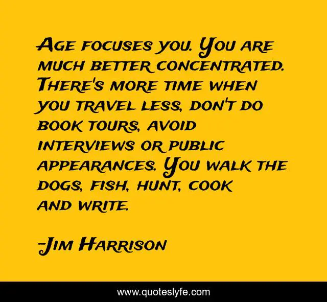 This page presents the quote "Age focuses you. You are much better concentrated. There's more time when you travel less, don't do book tours, avoid interviews or public appearances. You walk the dogs, fish, hunt, cook and write.". Author of this quote is Jim Harrison. This quote is about age, book, time,.