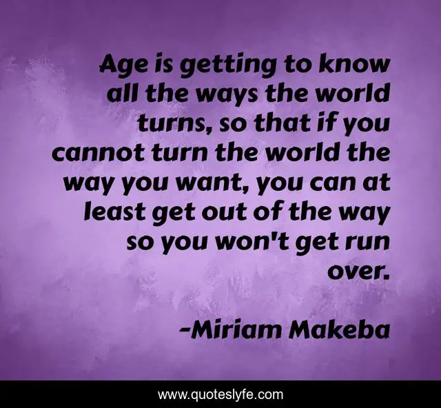 This page presents the quote "Age is getting to know all the ways the world turns, so that if you cannot turn the world the way you want, you can at least get out of the way so you won't get run over.". Author of this quote is Miriam Makeba. .