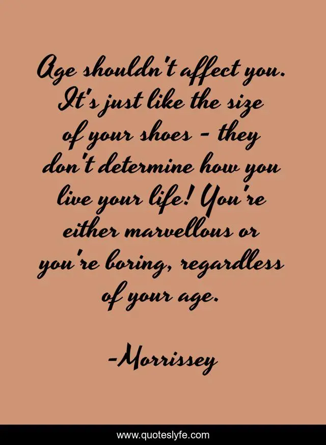 This page presents the quote "Age shouldn't affect you. It's just like the size of your shoes - they don't determine how you live your life! You're either marvellous or you're boring, regardless of your age.". Author of this quote is Morrissey. This quote is about life, live, shoes,.