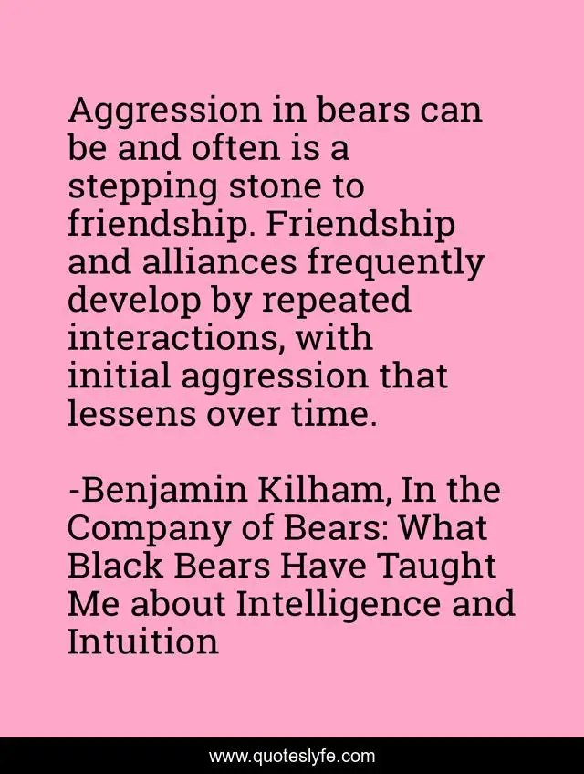 This page presents the quote "Aggression in bears can be and often is a stepping stone to friendship. Friendship and alliances frequently develop by repeated interactions, with initial aggression that lessens over time.". Author of this quote is Benjamin Kilham, In the Company of Bears: What Black Bears Have Taught Me about Intelligence and Intuition. This quote is about bears, behaviour, science,.