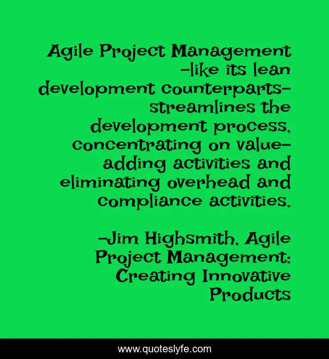 "Jim Highsmith, Agile Project Management: Creating Innovative Products Quotes." Quoteslyfe.com, 2025. Sat. 13 Dec. 2025. <https://www.quoteslyfe.com/quote/Agile-Project-Management-like-its-lean-development-194396>.
