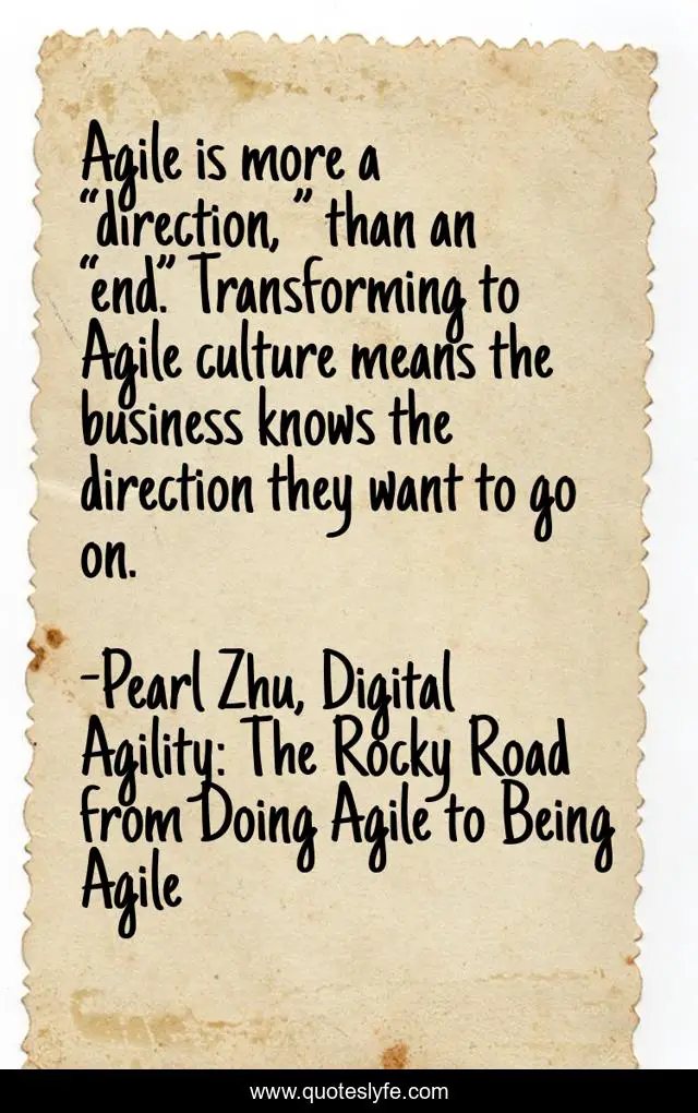This page presents the quote "Agile is more a “direction, ” than an “end.” Transforming to Agile culture means the business knows the direction they want to go on.". Author of this quote is Pearl Zhu, Digital Agility: The Rocky Road from Doing Agile to Being Agile. This quote is about agile, agility, culture,.