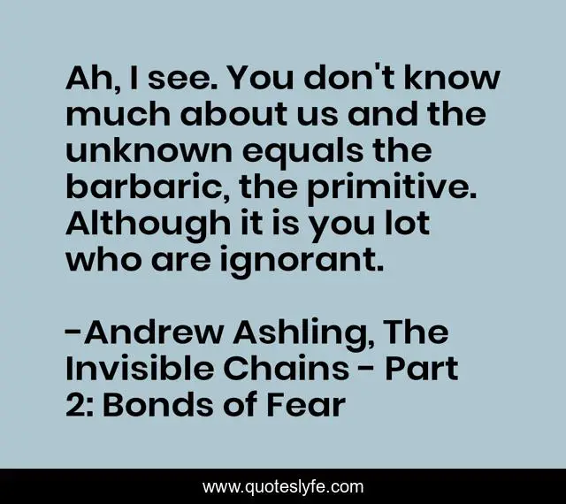 This page presents the quote "Ah, I see. You don't know much about us and the unknown equals the barbaric, the primitive. Although it is you lot who are ignorant.". Author of this quote is Andrew Ashling, The Invisible Chains - Part 2: Bonds of Fear. This quote is about intolerance, primitive, knowledge, unknow, ignorance, barbarian,.