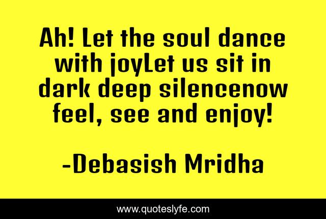 This page presents the quote "Ah! Let the soul dance with joyLet us sit in dark deep silencenow feel, see and enjoy!". Author of this quote is Debasish Mridha. This quote is about debasish, joy, philosophy, debasish-mridha, soul-dance-with-joy, mridha, dark-deep-silence, soul-dance, see-and-enjoy,.