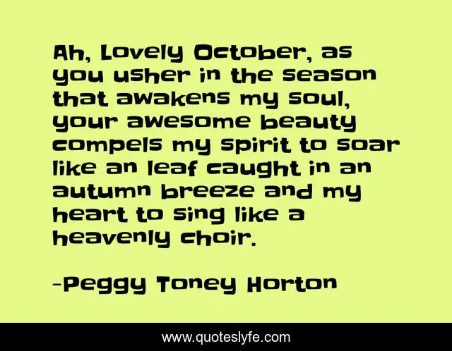 This page presents the quote "Ah, Lovely October, as you usher in the season that awakens my soul, your awesome beauty compels my spirit to soar like an leaf caught in an autumn breeze and my heart to sing like a heavenly choir.". Author of this quote is Peggy Toney Horton. This quote is about october, beauty, season, heavenly-choir, soul, spirit,.