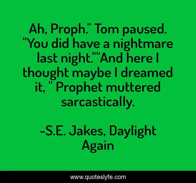 This page presents the quote "Ah, Proph." Tom paused. "You did have a nightmare last night.""And here I thought maybe I dreamed it, " Prophet muttered sarcastically.". Author of this quote is S.E. Jakes, Daylight Again. This quote is about nightmares, sarcasm, humor, snark, prophet-and-tommy,.