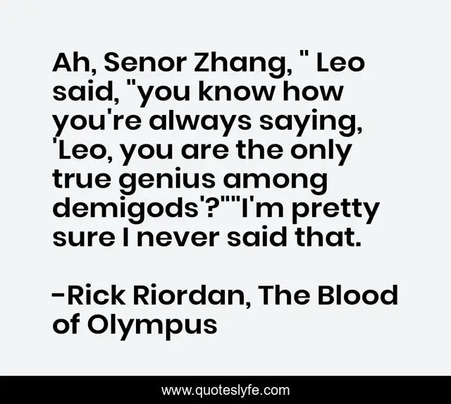 This page presents the quote "Ah, Senor Zhang, " Leo said, "you know how you're always saying, 'Leo, you are the only true genius among demigods'?""I'm pretty sure I never said that.". Author of this quote is Rick Riordan, The Blood of Olympus. This quote is about percy-jackson, leo-valdez, frank-zhang,.