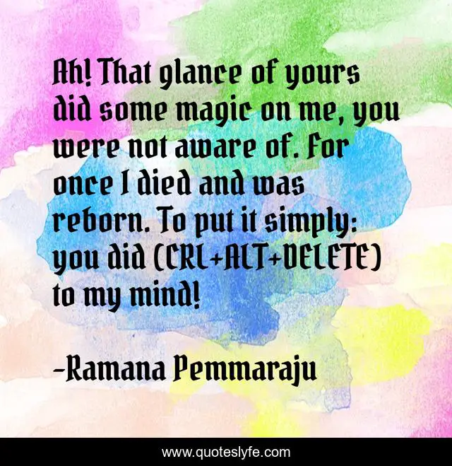 This page presents the quote "Ah! That glance of yours did some magic on me, you were not aware of. For once I died and was reborn. To put it simply: you did (CRL+ALT+DELETE) to my mind!". Author of this quote is Ramana Pemmaraju. This quote is about love, beauty, men, charisma, magic, affection, women,.