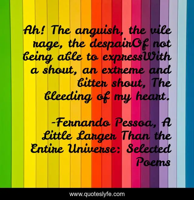This page presents the quote "Ah! The anguish, the vile rage, the despairOf not being able to expressWith a shout, an extreme and bitter shout, The bleeding of my heart.". Author of this quote is Fernando Pessoa, A Little Larger Than the Entire Universe: Selected Poems. This quote is about sadness, despair, poetry,.