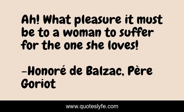This page presents the quote "Ah! What pleasure it must be to a woman to suffer for the one she loves!". Author of this quote is Honoré de Balzac, Père Goriot. This quote is about love, self-sacrifice, girls, generosity, suffering, purity, affection, women,.