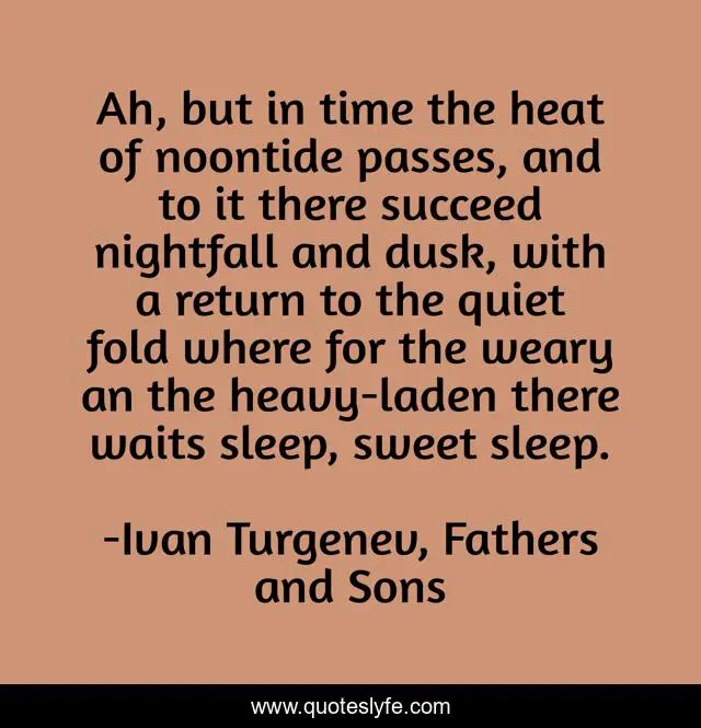 This page presents the quote "Ah, but in time the heat of noontide passes, and to it there succeed nightfall and dusk, with a return to the quiet fold where for the weary an the heavy-laden there waits sleep, sweet sleep.". Author of this quote is Ivan Turgenev, Fathers and Sons. .