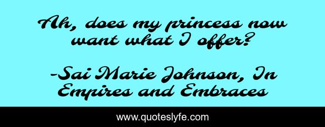 "Sai Marie Johnson, In Empires and Embraces Quotes." Quoteslyfe.com, 2025. Tue. 09 Dec. 2025. <https://www.quoteslyfe.com/quote/Ah-does-my-princess-now-want-what-213772>.