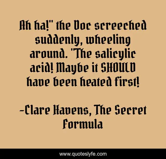 This page presents the quote "Ah ha!" the Doc screeched suddenly, wheeling around. "The salicylic acid! Maybe it SHOULD have been heated first!". Author of this quote is Clare Havens, The Secret Formula. This quote is about detective, mystery, humor, tween-noir, thriller,.