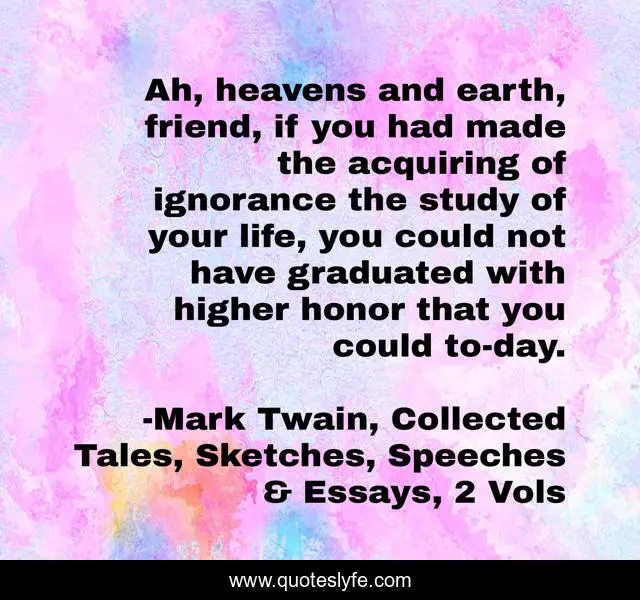 This page presents the quote "Ah, heavens and earth, friend, if you had made the acquiring of ignorance the study of your life, you could not have graduated with higher honor that you could to-day.". Author of this quote is Mark Twain, Collected Tales, Sketches, Speeches & Essays, 2 Vols. This quote is about education, ignorance,.