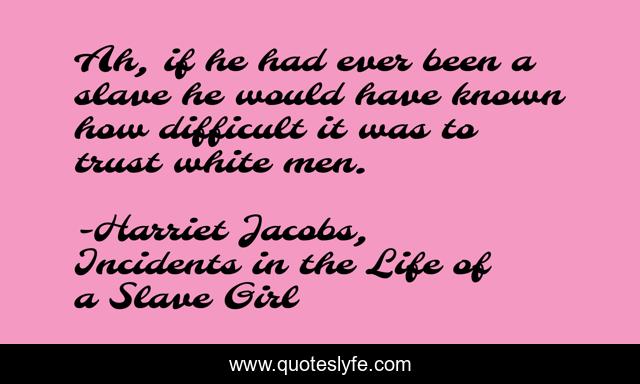 This page presents the quote "Ah, if he had ever been a slave he would have known how difficult it was to trust white men.". Author of this quote is Harriet Jacobs, Incidents in the Life of a Slave Girl. This quote is about incidents, slavery,.
