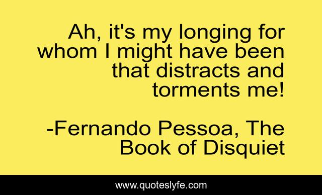 This page presents the quote "Ah, it's my longing for whom I might have been that distracts and torments me!". Author of this quote is Fernando Pessoa, The Book of Disquiet. This quote is about longing, self, regret, dreams,.