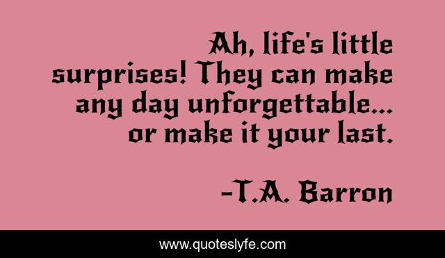 This page presents the quote "Ah, life's little surprises! They can make any day unforgettable... or make it your last.". Author of this quote is T.A. Barron. .