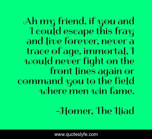This page presents the quote "Ah my friend, if you and I could escape this fray and live forever, never a trace of age, immortal, I would never fight on the front lines again or command you to the field where men win fame.". Author of this quote is Homer, The Iliad. This quote is about peace, escape, fame, war,.