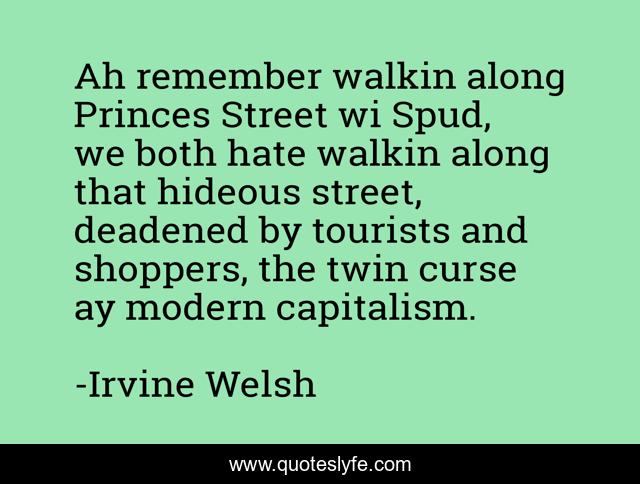 This page presents the quote "Ah remember walkin along Princes Street wi Spud, we both hate walkin along that hideous street, deadened by tourists and shoppers, the twin curse ay modern capitalism.". Author of this quote is Irvine Welsh. This quote is about shopping, tourism, capitalism,.