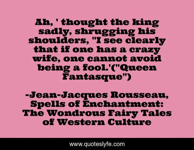This page presents the quote "Ah, ' thought the king sadly, shrugging his shoulders, "I see clearly that if one has a crazy wife, one cannot avoid being a fool.'("Queen Fantasque")". Author of this quote is Jean-Jacques Rousseau, Spells of Enchantment: The Wondrous Fairy Tales of Western Culture. This quote is about fool, crazy, husband, wife,.