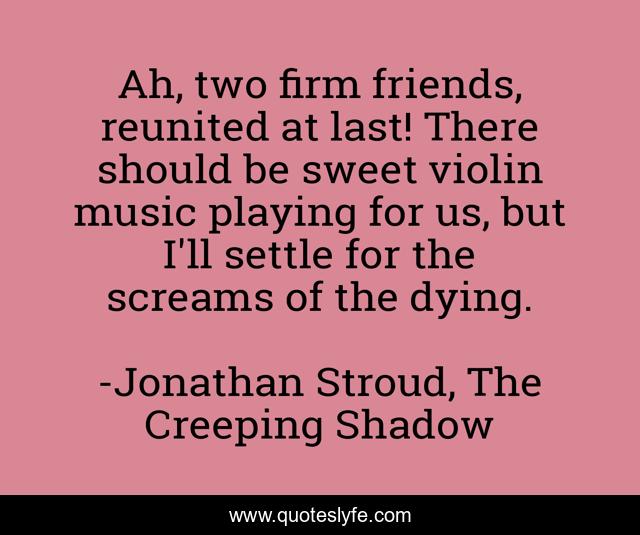 This page presents the quote "Ah, two firm friends, reunited at last! There should be sweet violin music playing for us, but I'll settle for the screams of the dying.". Author of this quote is Jonathan Stroud, The Creeping Shadow. .