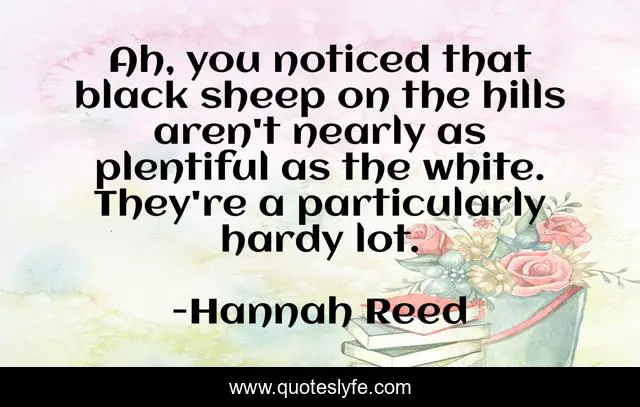 This page presents the quote "Ah, you noticed that black sheep on the hills aren't nearly as plentiful as the white. They're a particularly hardy lot.". Author of this quote is Hannah Reed. .
